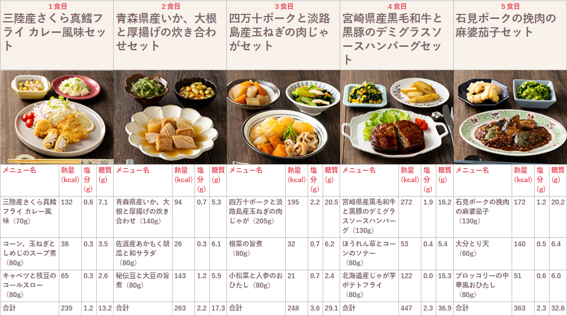 献立メニューの一部ですが、各お料理の成分明細も含めてホームページで確認できるから安心です。